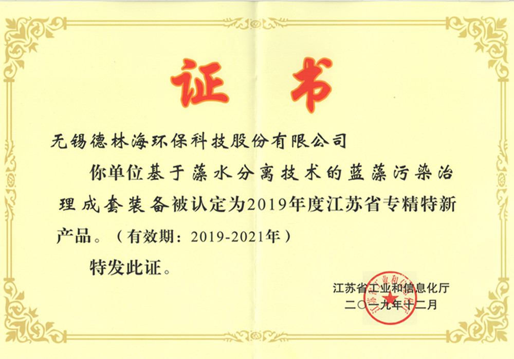 近日,江蘇省工業(yè)和信息化廳公布了2019年度省級專精特新產(chǎn)品認(rèn)定名單,我司的“基于藻水分離技術(shù)的藍(lán)藻污染治理成套裝備”成功入選。