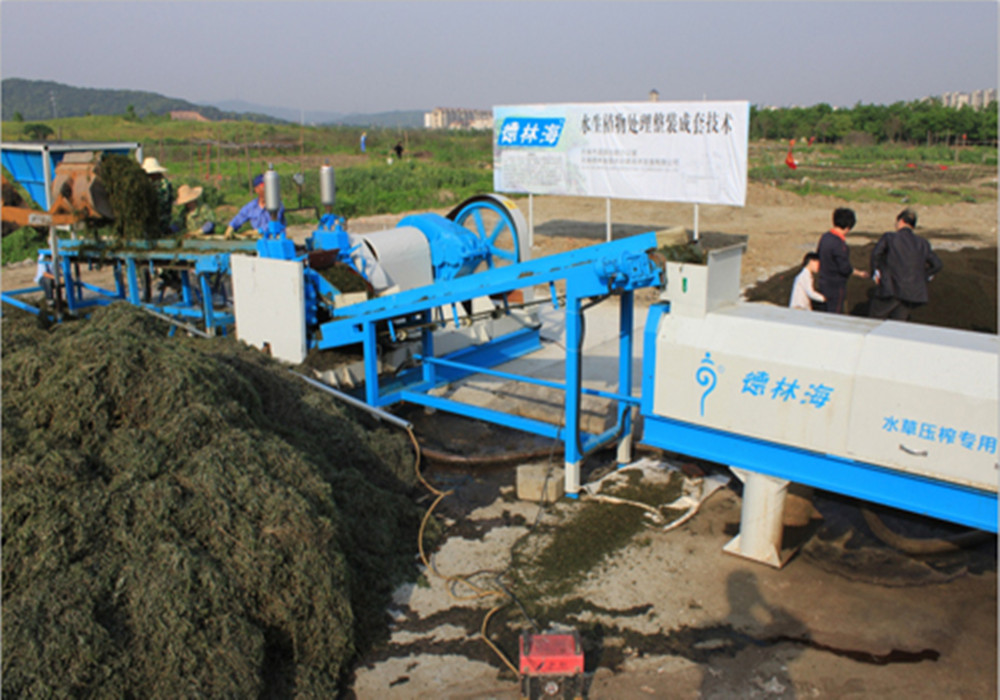 無(wú)錫太湖梅梁灣水草處理基地位于漁港藻水分離站鄰側(cè),占地約1200m2,由無(wú)錫德林海公司投資、研發(fā)和建設(shè)。德林海公司研發(fā)的水生植物處理整裝成套技術(shù)能將水草、水葫蘆、水花生等水生植物由水分大于95%的鮮草狀態(tài)處理成水分小于65%的固態(tài)渣狀,從而便于實(shí)現(xiàn)無(wú)害化處置和資源化利用。水生植物處理能力每天300噸。