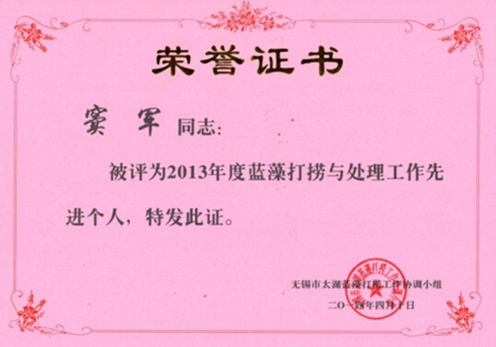 2015年4月21日上午,無(wú)錫市太湖藍(lán)藻打撈工作協(xié)調(diào)小組舉行頒獎(jiǎng)儀式,表彰在2013年在太湖藍(lán)藻打撈、處理工作中的先進(jìn)集體與個(gè)人。我公司員工竇軍榮獲“2013年度藍(lán)藻打撈與處理工作先進(jìn)個(gè)人”稱號(hào)。