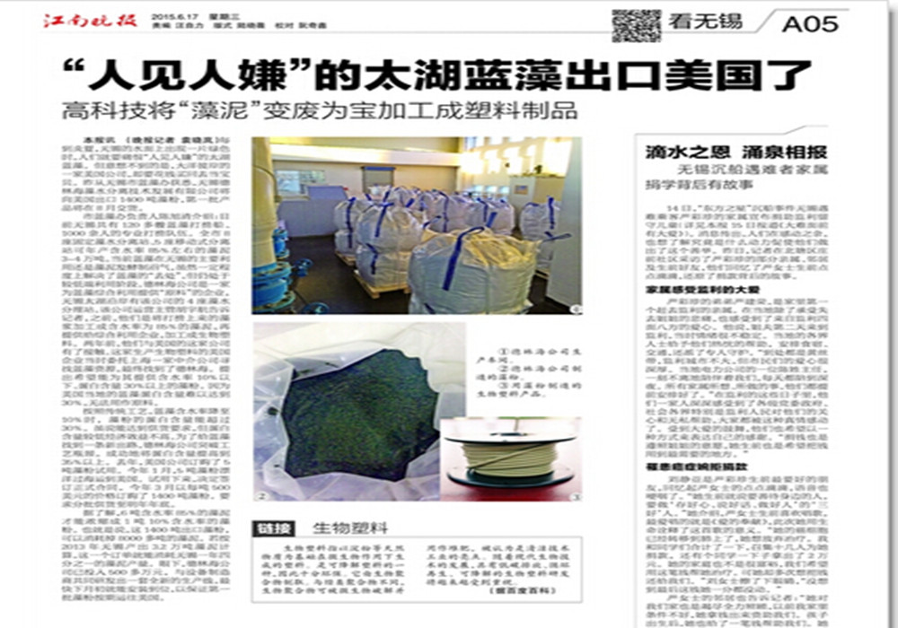 (2015年6月18日)無(wú)錫藍(lán)藻資源化利用又走出一條新路。無(wú)錫德林海藻水分離技術(shù)發(fā)展有限公司已研制出將藻泥制成含水率10%以下的藻粉技術(shù),這些藻粉可制成生物塑料,目前已接到一家美國(guó)企業(yè)1400噸的訂單。