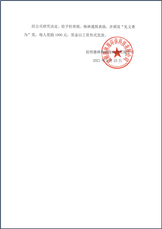 公司獲悉杜奕銳和楊林見義勇為的事跡后,對(duì)二人的行為予以了高度評(píng)價(jià):“在他人生命面臨危險(xiǎn)時(shí),杜奕銳和楊林沒有選擇退縮,他們見義勇為的行為值得公司廣大員工學(xué)習(xí)。他們?cè)谕炀人松耐瑫r(shí),也為公司樹立了良好的、正面的企業(yè)形象,使得德林海人勇敢無畏、富有正義感、極具社會(huì)責(zé)任感的優(yōu)秀精神品質(zhì)深入人心?!辈⑾蚨祟C發(fā)“見義勇為”獎(jiǎng),獎(jiǎng)勵(lì)每人1000元獎(jiǎng)金。