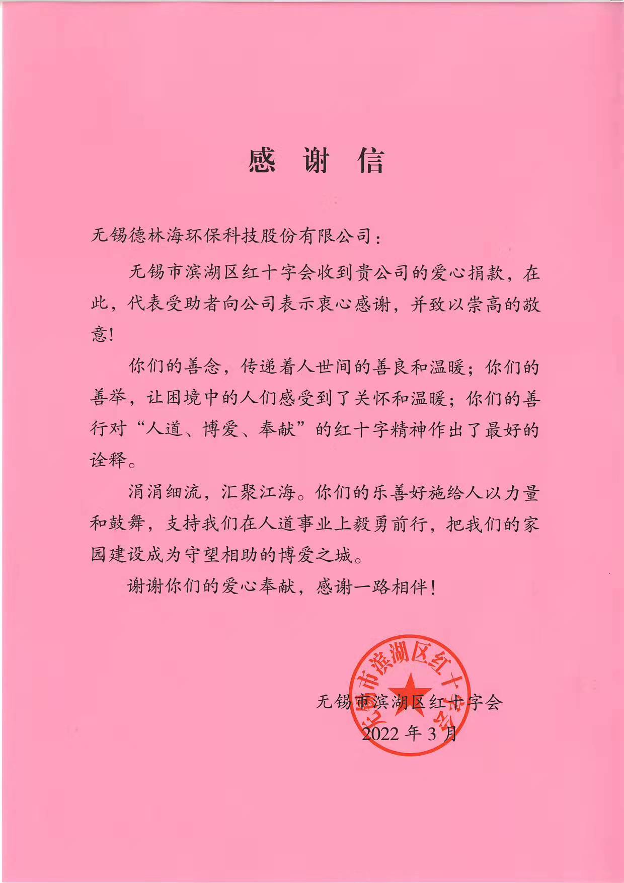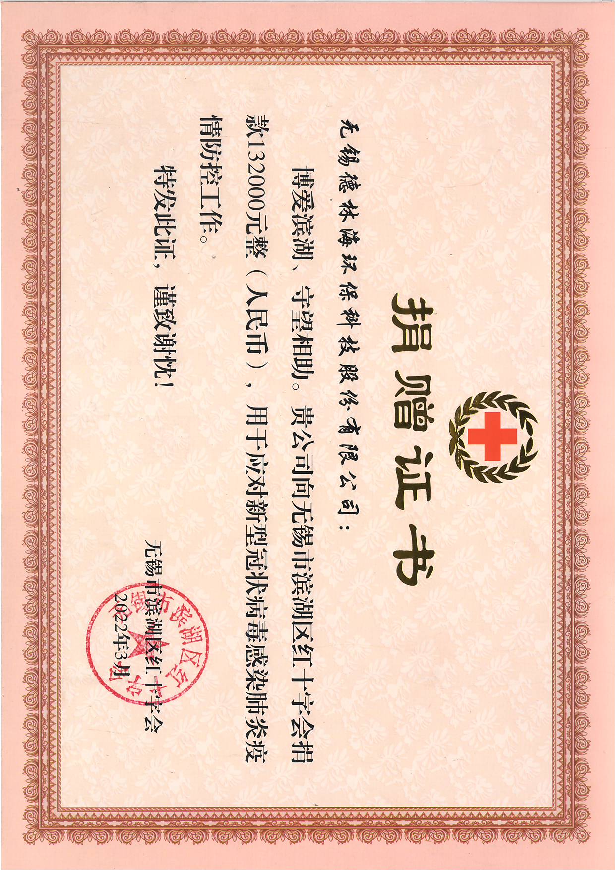 2022年3月14日,德林海向無錫市濱湖區(qū)紅十字會(huì)捐款人民幣132000元整,用于應(yīng)對新冠肺炎疫情防控工作。