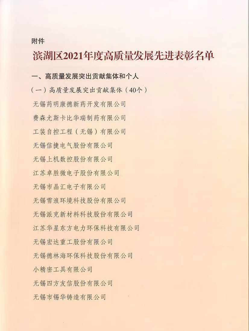 2022年5月4日,無(wú)錫市濱湖區(qū)委、區(qū)政府召開(kāi)全區(qū)2021年度綜合考核總結(jié)表彰大會(huì),通報(bào)全區(qū)2021年度綜合考核(評(píng)價(jià))結(jié)果,對(duì)在區(qū)年度考核和一季度“擔(dān)使命作貢獻(xiàn)”季季評(píng)中表現(xiàn)出色的先進(jìn)集體和個(gè)人進(jìn)行表彰。無(wú)錫德林海環(huán)??萍脊煞萦邢薰颈皇谟琛案哔|(zhì)量發(fā)展突出貢獻(xiàn)集體”稱(chēng)號(hào)。