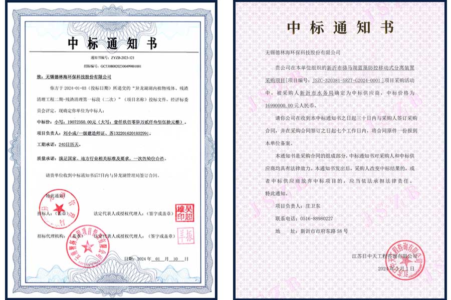 卯兔辭舊歲,辰龍迎新春,隨著2024年的到來,德林海迎來了一個雙喜臨門的開頭。新年伊始的首季,公司連續(xù)中標異龍湖湖內(nèi)植物殘體、殘渣清理工程二期-殘渣清理第一標段(簡稱“異龍湖清淤項目”)和新沂市駱馬湖藍藻防控移動式分離裝置采購項目(簡稱“駱馬湖項目”)。這兩個項目的中標為德林海帶來了總計3606萬元的合同。