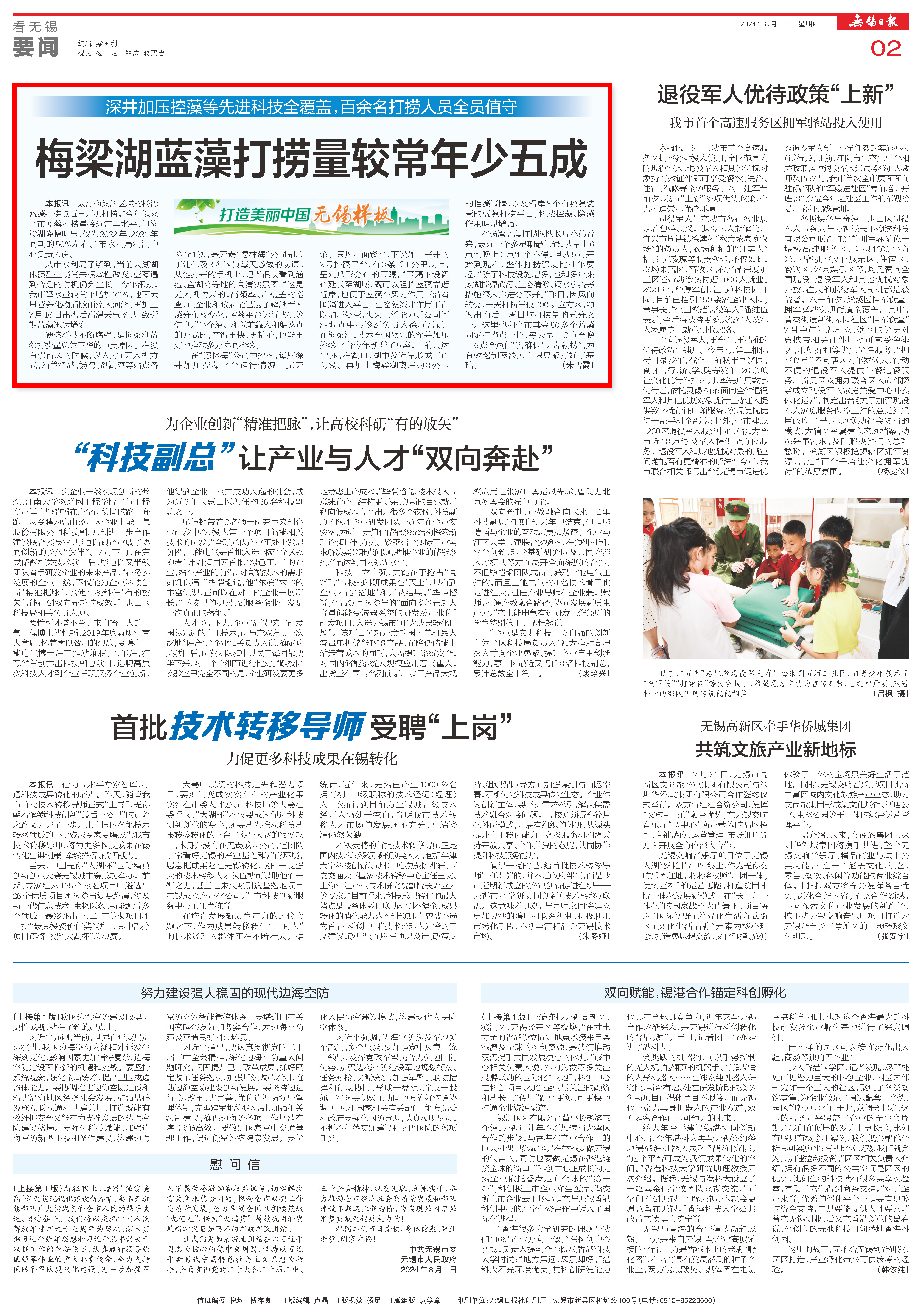 《無錫日報》于2024年8月1日發(fā)布了題為《深井加壓控藻等先進科技全覆蓋,百余名打撈人員全員值守——梅梁湖藍藻打撈量較常年少五成》的報道。