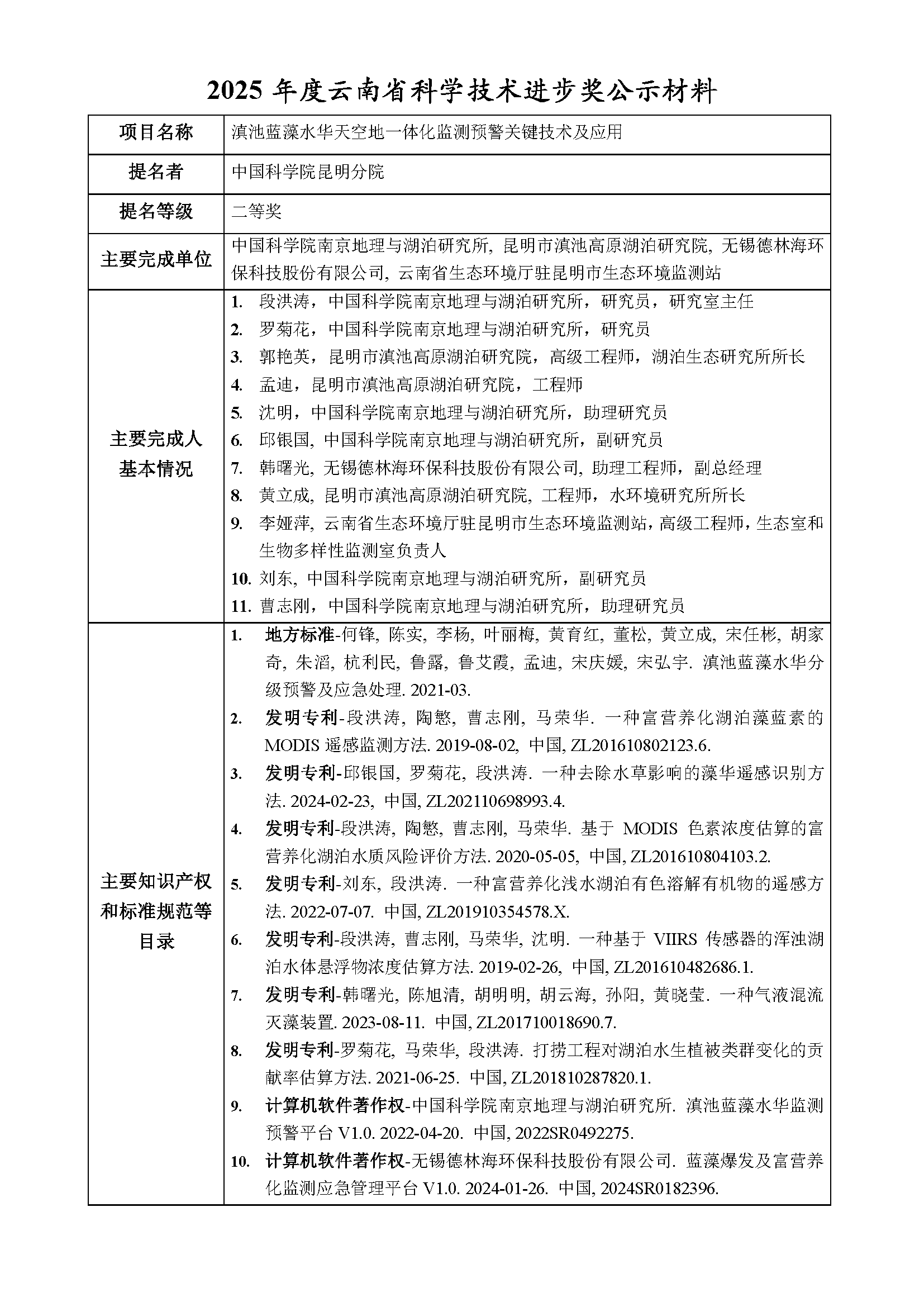 根據(jù)《云南省科技廳關(guān)于2025年度云南省科學(xué)技術(shù)獎(jiǎng)提名工作的通知》的相關(guān)要求,現(xiàn)對(duì)中國(guó)科學(xué)院昆明分院擬提名我公司作為主要完成單位參與申報(bào)的2025年度云南省科學(xué)技術(shù)進(jìn)步獎(jiǎng)項(xiàng)目“滇池藍(lán)藻水華天空地一體化監(jiān)測(cè)預(yù)警關(guān)鍵技術(shù)及應(yīng)用”進(jìn)行公示,我公司主要完成人為:韓曙光;詳見《2025年度云南省科學(xué)技術(shù)進(jìn)步獎(jiǎng)公示材料》。