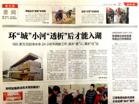 (2015年1月21日)無(wú)錫萬(wàn)象城開(kāi)業(yè)了,開(kāi)發(fā)商在環(huán)萬(wàn)象城挖了一條環(huán)城河道,因?yàn)楹铀涣魍?,時(shí)間一長(zhǎng)就發(fā)黑發(fā)臭,為此萬(wàn)象城向我公司購(gòu)置了最新研制的黑臭河道水體快速凈化設(shè)備(即清水車)。