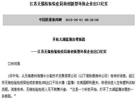 3月中旬,從無(wú)錫德林海藻水分離技術(shù)發(fā)展有限公司(以下簡(jiǎn)稱德海林公司)傳來(lái)好消息:經(jīng)江蘇無(wú)錫檢驗(yàn)檢疫局檢疫的首批5噸出口干淡水藻(藍(lán)藻)在美國(guó)順利通關(guān),將很快進(jìn)入生物塑料試制流程。消息傳來(lái),無(wú)錫檢驗(yàn)檢疫人無(wú)不鼓舞興奮:“這是一個(gè)好的開(kāi)始,打開(kāi)了太湖藍(lán)藻治理的一條新路。”