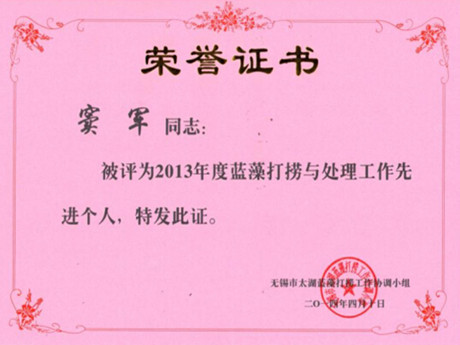 2015年4月21日上午,無(wú)錫市太湖藍(lán)藻打撈工作協(xié)調(diào)小組舉行頒獎(jiǎng)儀式,表彰在2013年在太湖藍(lán)藻打撈、處理工作中的先進(jìn)集體與個(gè)人。