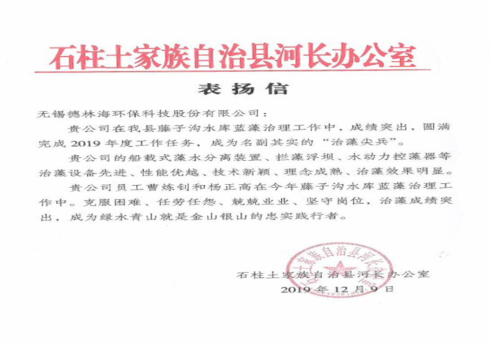 今年4月,重慶石柱土家族自治縣河長辦公室向我司采購了船載式藻水分離裝置、攔藻浮壩、水動力控藻器等治藻設(shè)備,由于現(xiàn)場作業(yè)條件特殊,我司員工克服困難、任勞任怨、兢兢業(yè)業(yè)的完成了工作任務(wù)。信中對我司圓滿完成重慶藤子溝水庫藍(lán)藻治理工作,給予高度好評,贊揚我司是名副其實的“治藻尖兵”。