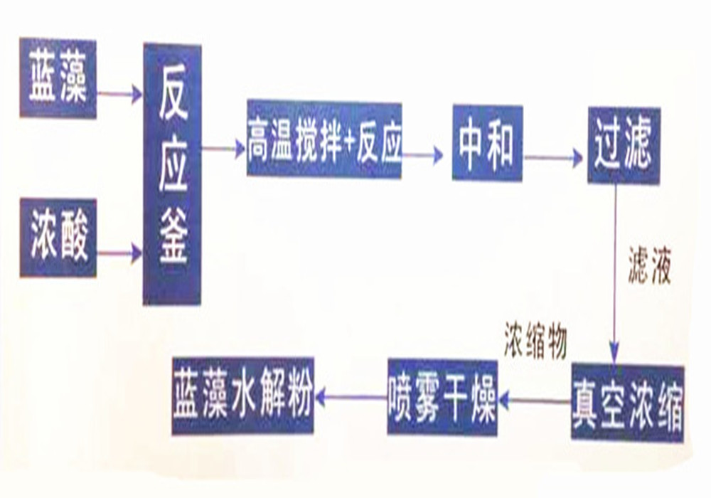 (2013年4月10日)對打撈上岸的藍藻實施安全、有效的后續(xù)處理是藍藻治理過程的又一關鍵環(huán)節(jié),而將藍藻進行資源化利用則是藍藻最為理想的出路。藍藻蛋白質(zhì)含量近50%,并含有特殊的藻藍蛋白,利用潛力巨大。采用水解技術將藍藻進行水解并進行濃縮與干燥制成復合氨基酸粉,可作為飲料原料。 工藝流程: