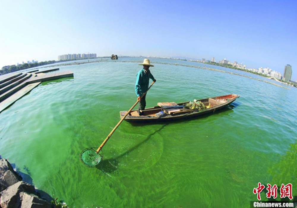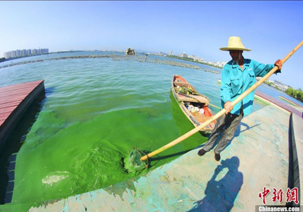2013年7月24日,浙江紹興,由于污染嚴(yán)重導(dǎo)致水質(zhì)惡化,每年夏季柯橋瓜渚湖都會爆發(fā)藍(lán)藻。2012年藍(lán)藻大爆發(fā)時(shí),直接導(dǎo)致10多萬斤養(yǎng)殖魚死亡。今年入夏以來,也有數(shù)千斤魚類死亡,由于魚類死亡太多,因此今年漁民不再放養(yǎng)魚苗。