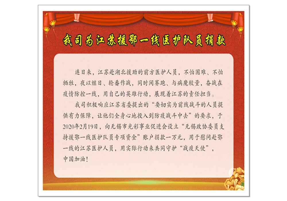 我司積極響應(yīng)江蘇省委提出的“要切實為前線戰(zhàn)斗的人員提供有力保障,讓他們?nèi)硇牡赝度氲椒酪邞?zhàn)斗中去”的要求,于2020年2月19日,向無錫市光彩事業(yè)促進會設(shè)立“無錫政協(xié)委員支持援鄂一線醫(yī)護隊員專項資金”賬戶捐款一萬元,用于慰問赴鄂一線的江蘇醫(yī)護人員,用實際行動來共同守護“戰(zhàn)疫天使”,中國加油!