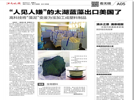 (2015年6月18日)無錫藍藻資源化利用又走出一條新路。無錫德林海藻水分離技術(shù)發(fā)展有限公司已研制出將藻泥制成含水率10%以下的藻粉技術(shù),這些藻粉可制成生物塑料,目前已接到一家美國企業(yè)1400噸的訂單。