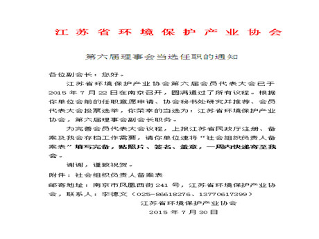 祝賀我司當選為:江蘇省環(huán)境保護產(chǎn)業(yè)協(xié)會第六屆理事會副會長職務(wù)